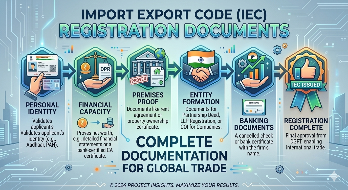 Businesses applying for an IEC must submit specific Import Export Code Registration Documents during the application process. These documents verify the identity and business structure of the applicant.