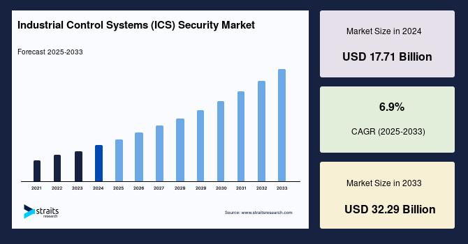 According to StraitsResearch, the global industrial control systems security market size was valued at USD 17.71 billion in 2024 and is estimated to reach USD 32.29 billion by 2033, growing at a CAGR of 6.9% during 2025-2033.